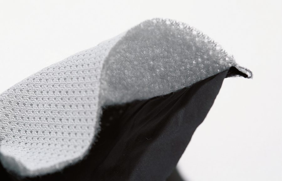 「表」の軽量タフタと「裏」のメッシュ(グレーの部分※実際は黒)。メッシュ生地の裏側は起毛で、ここで生まれた熱が中間の空気層にため込まれる。