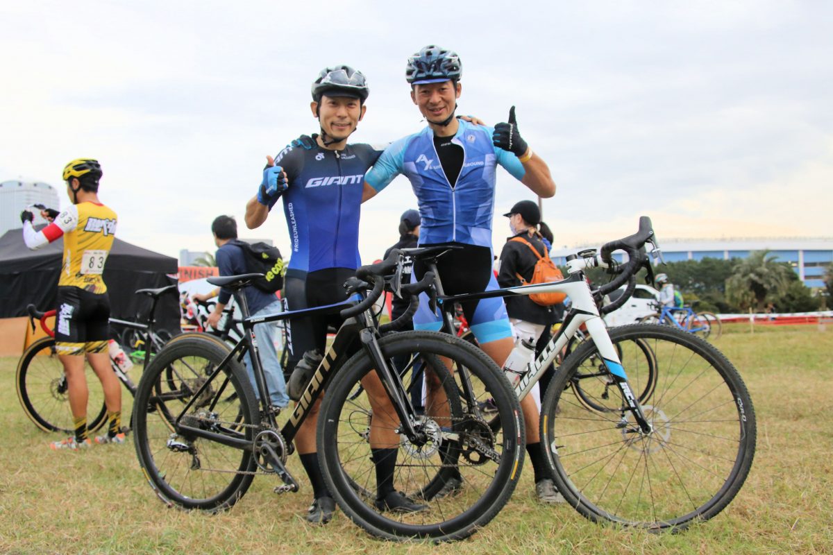 レース後に称えあう斎藤朋寛と合田正之(AX シクロクロスチーム)。ともにジャイアントTCXに乗るが、斎藤は新型TCXアドヴァンスドに SLR 1 42 DISC Hookless ホイールの組み合わせで走った。