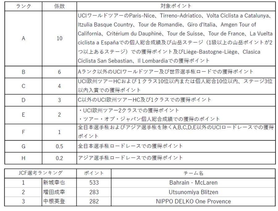 男子では1位新城は群を抜いていたが、2位増田と3位中根が僅差で争っていた。最終的には選考期間が終わる直前の10月12日、スペン・オルディシアで開催された、UCIレースでこのポイントが確定している。