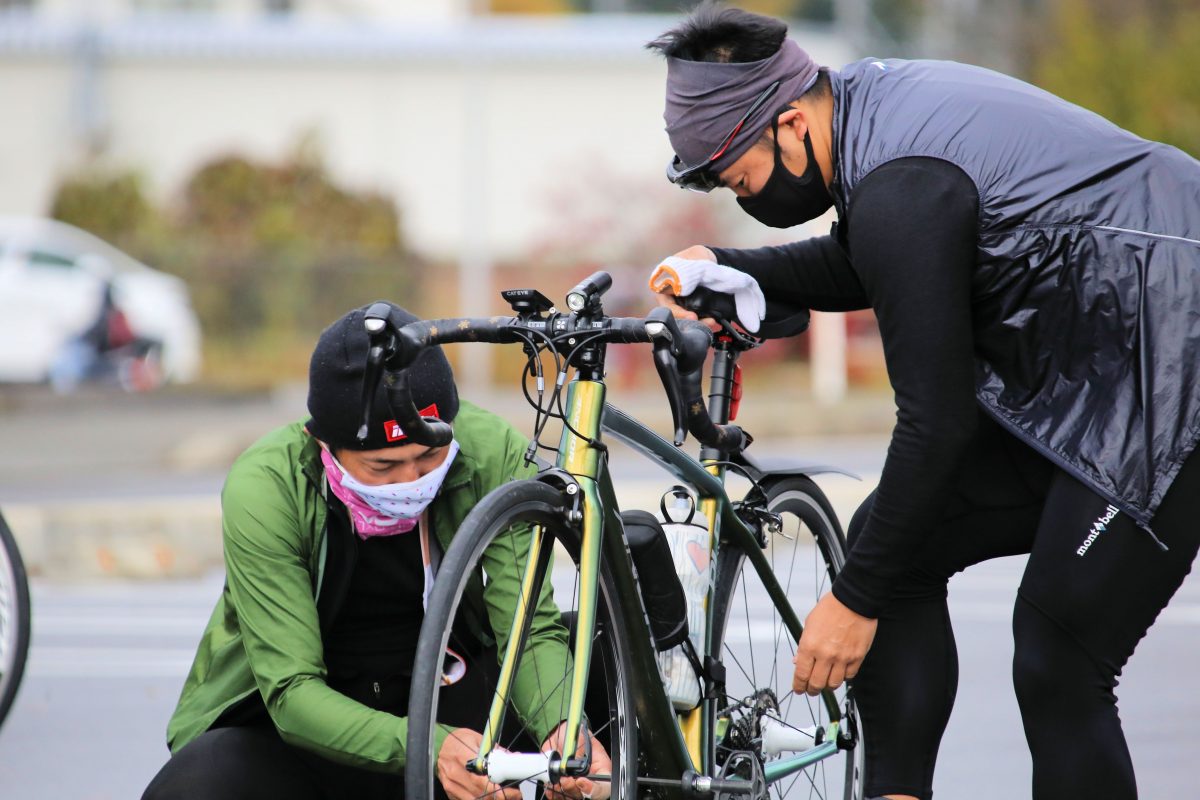 スタート前バイクの調整をする筧五郎さん。自転車ショップ「56サイクル」店長。ヒルクライムレースでは数々のタイトルを持つ。