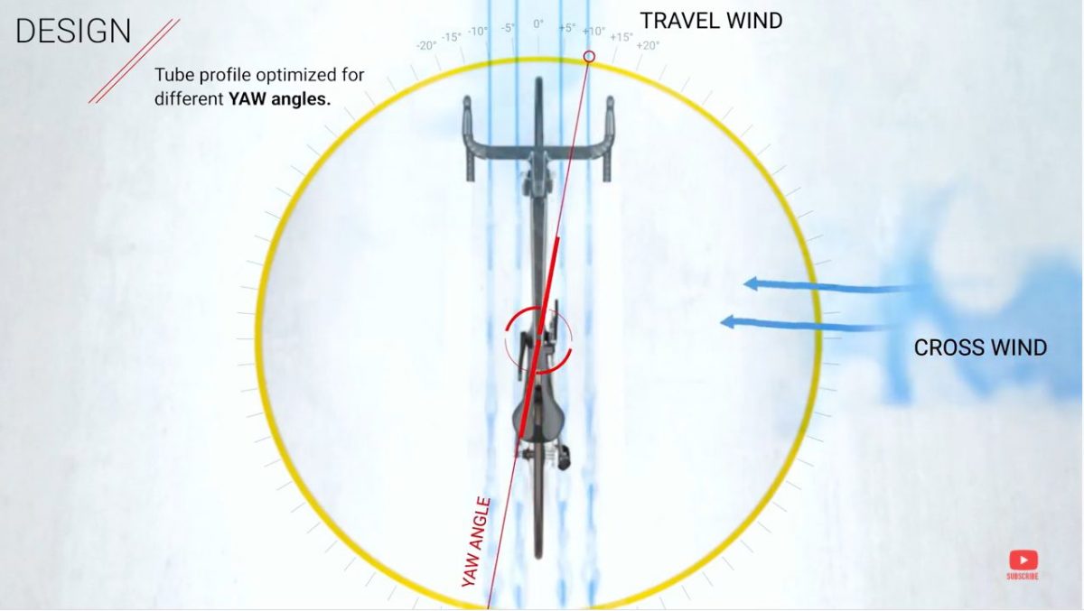 フィランテSLRではフレームの断面形状をさらにアップデート、すでにチェント10プロで採用していたカムテールデザインを改良し、横風の影響をより小さくしている。自転車は正面からの風だけではなく、横風の影響をうけるため、いわゆるヨー角をつけた風に対しても空気抵抗を抑える工夫が必要になる。そのためフィランテSLRではカムテールのテール部分を丸くしたデザインにしている。