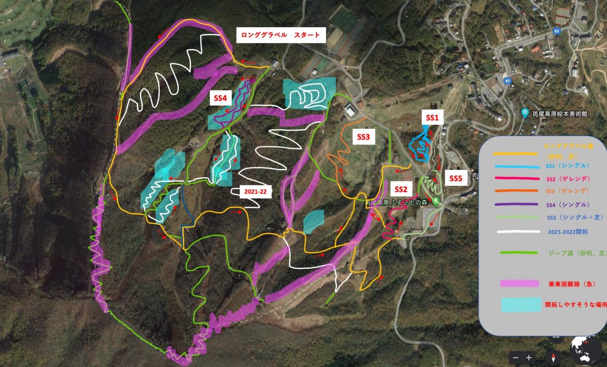MAPにあるシングルトラックSSSからSS5まで、さらにジープロードがすでに整備されているコース。今後さらにコースを広げていく計画だ。