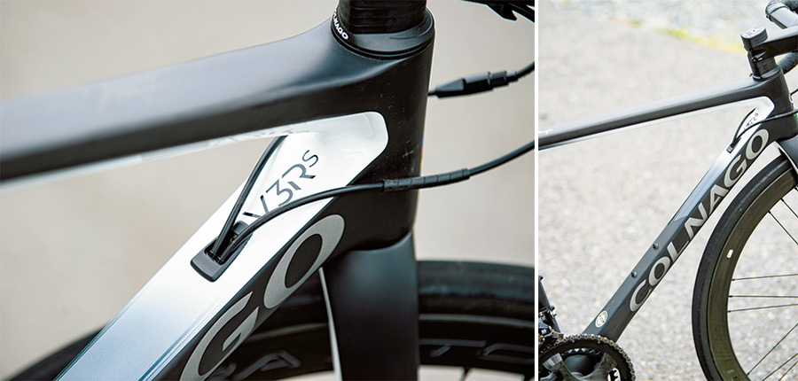 Vシリーズは誕生当初から軽さと空力性能を追求したモデルとしてのコンセプトを継承する。V3-RSはフロントフォーク、ダウンチューブ、シートチューブ各所に最先端のエアロ形状であるカムテールチューブを採用。また、シートステー位置を下げたコンパクトなリアバック設計を特徴とする。さらに、コルナゴオリジナルのSR9ステムと電動コンポーネントを組み合わせることで、現代の最先端スタイリングともいえるブレーキとシフトケーブルの完全内装化を実現する。