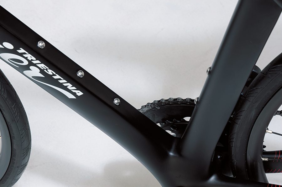 エアロ形状のダウンチューブにはボトルケージ台座が3つ設けられ高さが変更できる。