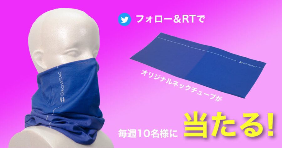 Twitterでフォロー&RTをすると、GROWTACオリジナルネックチューブ(非売品)を毎週10名様にプレゼントします。