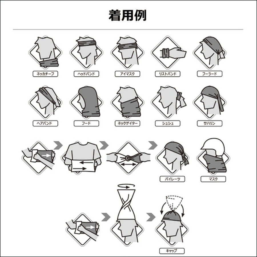 『buff』は1枚で10通り以上の使い方が可能で、バンダナ・キャップ・ヘッドバンド・ネックウォーマー・ネッカチーフ・ヘアバンド・フェイスガード・フェイスマスク・キャップ・シュシュ・リストバンドなど、アレンジは自由自在。