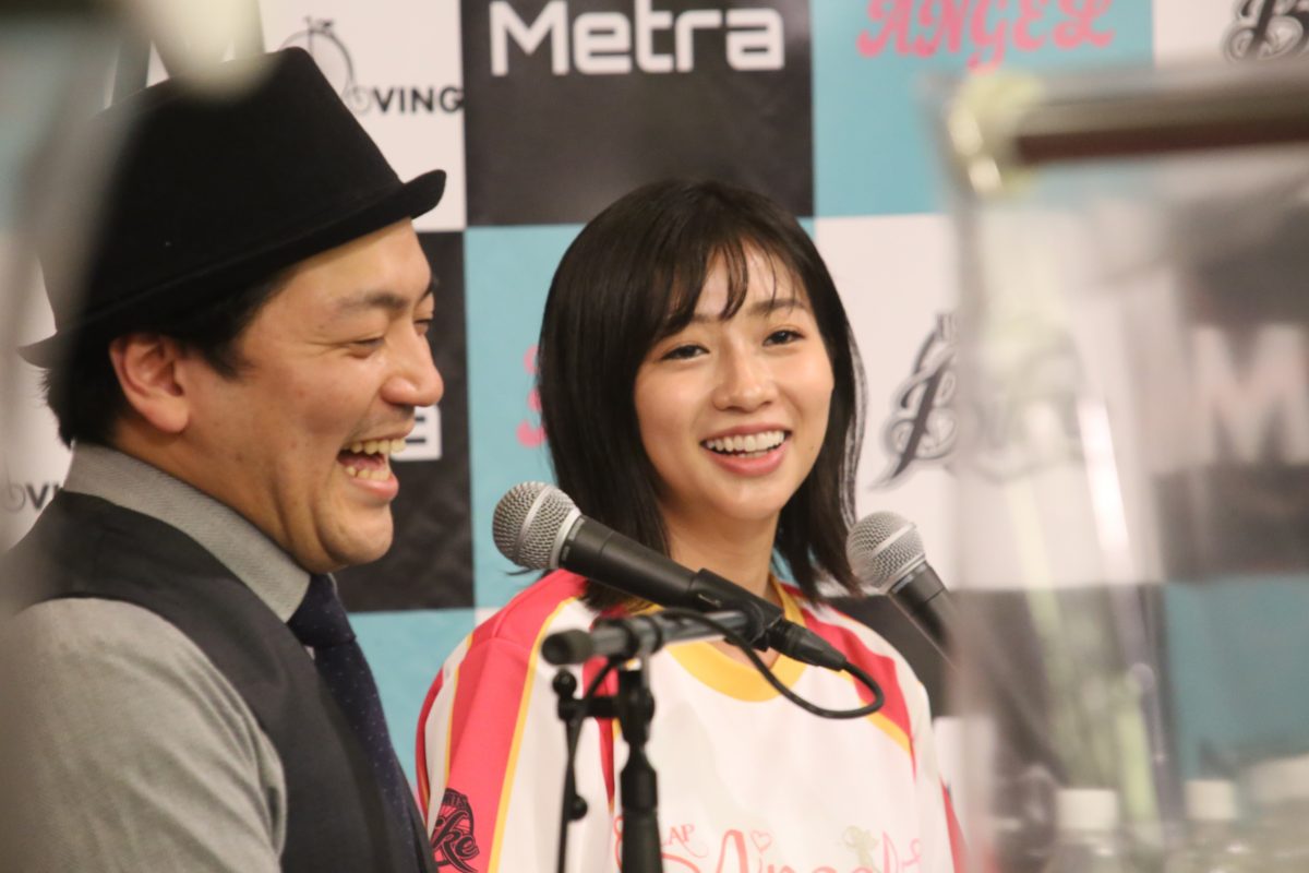 今回大会の実況を担当したMC関原さん(左)とグラビアアイドル、タレント、女優として活躍する小貫彩香さん。HORAIZON SPRINTOレースには大貫さんのサイン入りジャージが贈呈される。