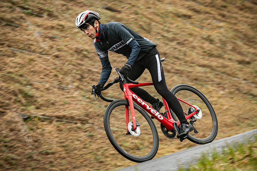 キレのある振り心地、軽量の駆動感というサーヴェロロードバイクの特徴を継承しながら、路面状況を選ばずにフィールドを広げていけるのがカレドニアを相棒にする楽しさだ。60mmのトレイルで優雅に安定したハンドリングは最適な走行ラインを焦らずにトレースできる。オンロードでは接地トーンがフワッと滑らか、クライミングではシャキシャキと切れるストレートフォークの立ちまわりに、BBウィップを効かせたダイナミックなライディングがマッチする。