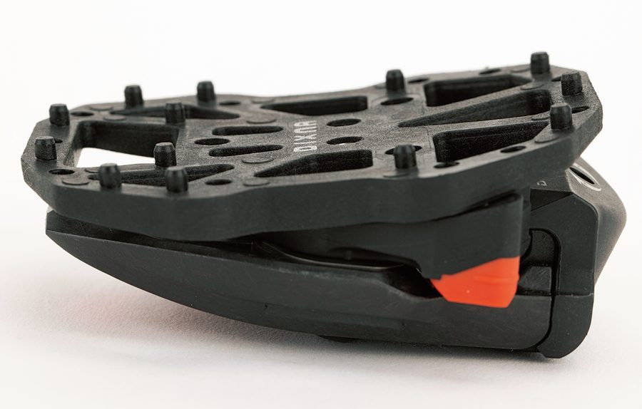 一体成型の3mmピンが13本配置されシューズとのグリップも良好。曲面をもたせたデザインで踏み心地がよく、快適性も配慮されている。