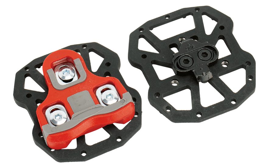 フラットペダルの踏み面にクリートの取り付け穴を設けたアイデア商品で、手持ちのビンディングペダルをフラットペダル化することが可能だ。