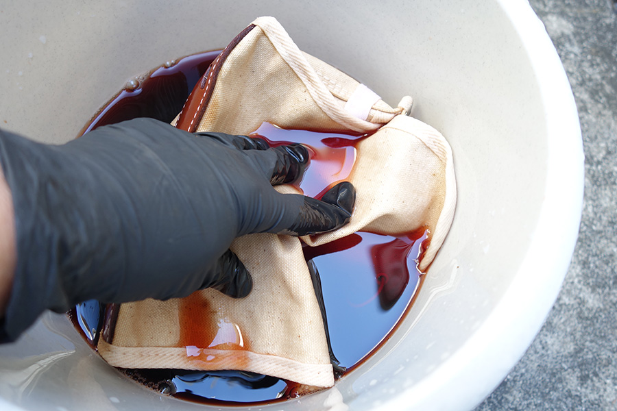 晩秋の空の下で、柿渋染めをしているという行為がなんだか心身を落ち着かせる。田舎暮らしを始めたかのような、都市圏にいながらにしてのエア移住感。バッグやアイテムなど、化学繊維よりも天然素材のものが多いという、シブめの自転車に乗っている人にオススメだ。