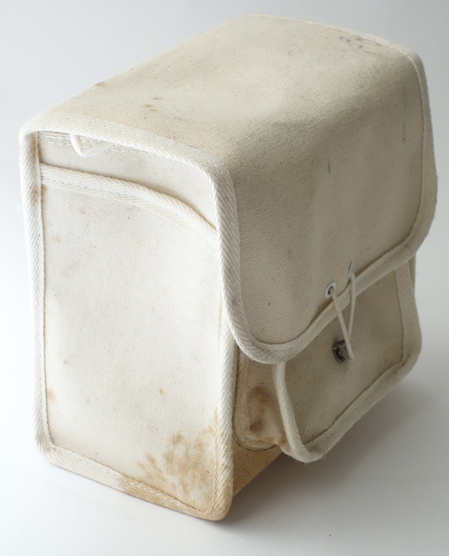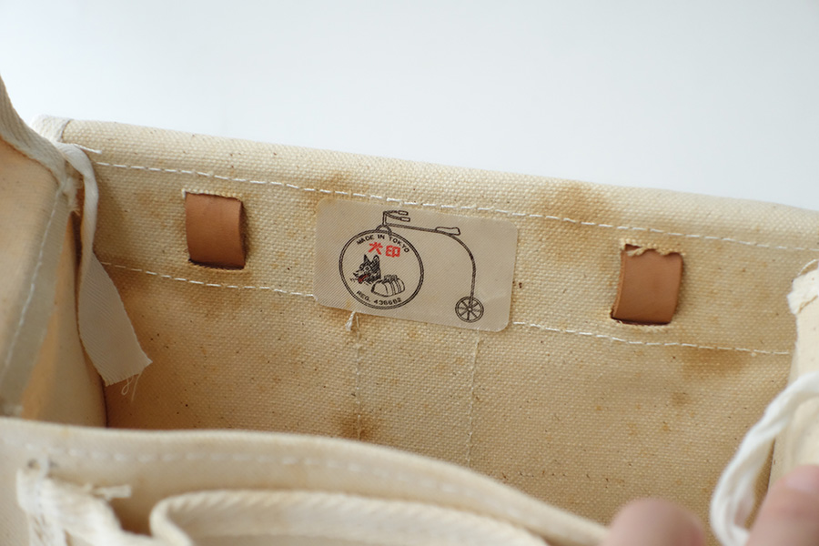 犬印の自転車バッグは、いまも生産されているが、これは現在の会社に代わる前の時代の犬印だ。未使用とはいえ、40年以上も経過しているから、とうぜんカビなどのシミも生じるわけ。