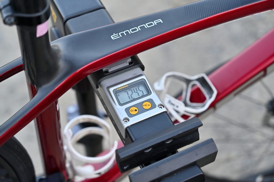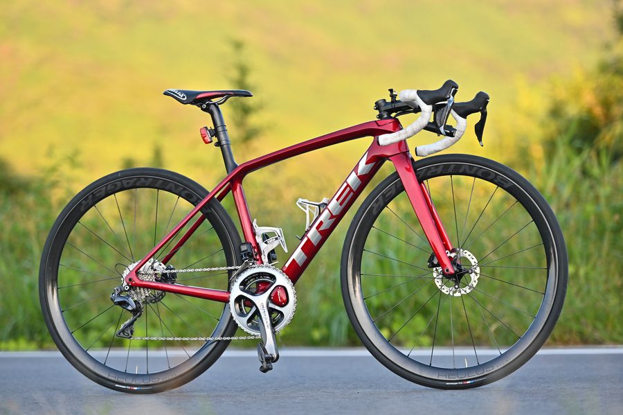 僕の新型エモンダSLRはフレーム重量699g、フォーク重量370gだね(共に公称値)。ブレーキ内蔵でエアロロード化しているのにとても軽量だね。僕のバイクはけっして軽いパーツはついていないし、ハンドルやステムは一般的なアルミモデルで、コンポーネントにはアルテグラなども含まれている。それでも7.24kgの軽さはさすがエモンダだね。今回、ホイールは空力性能にすぐれながらヒルクライムに向いているボントレガーの最新型アイオロスRSL37(クリンチャー)をアッセンブルしている。