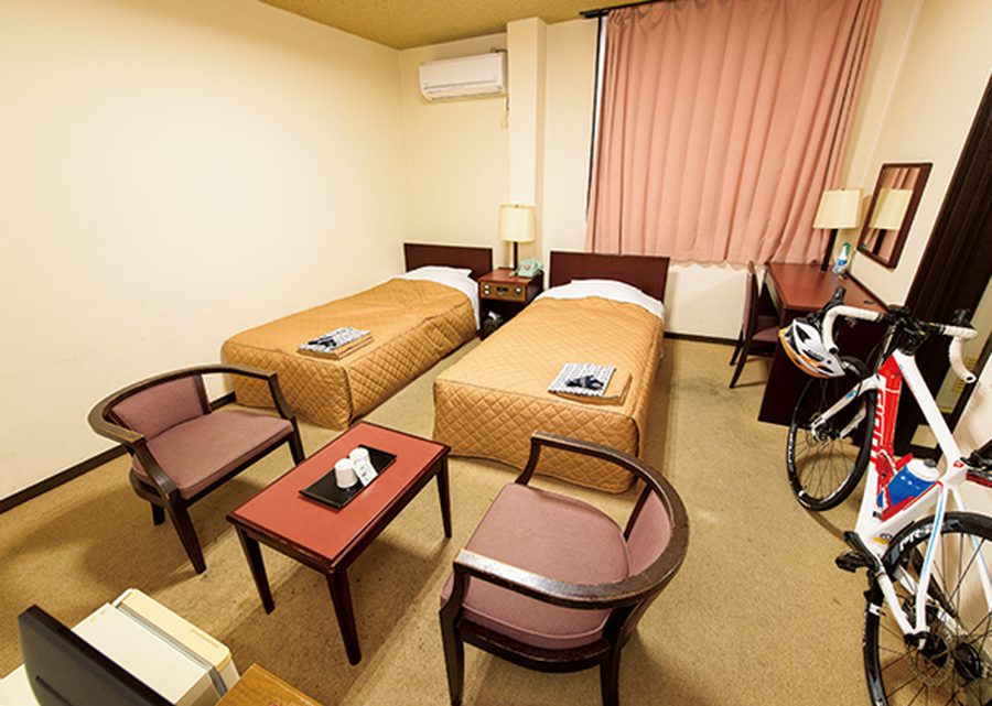 国道408号沿いのホテル。館内はもちろん、客室への自転車持ち込みにも対応。事前予約をすれば館内レストランで朝食、夕食が食べられる(有料)。