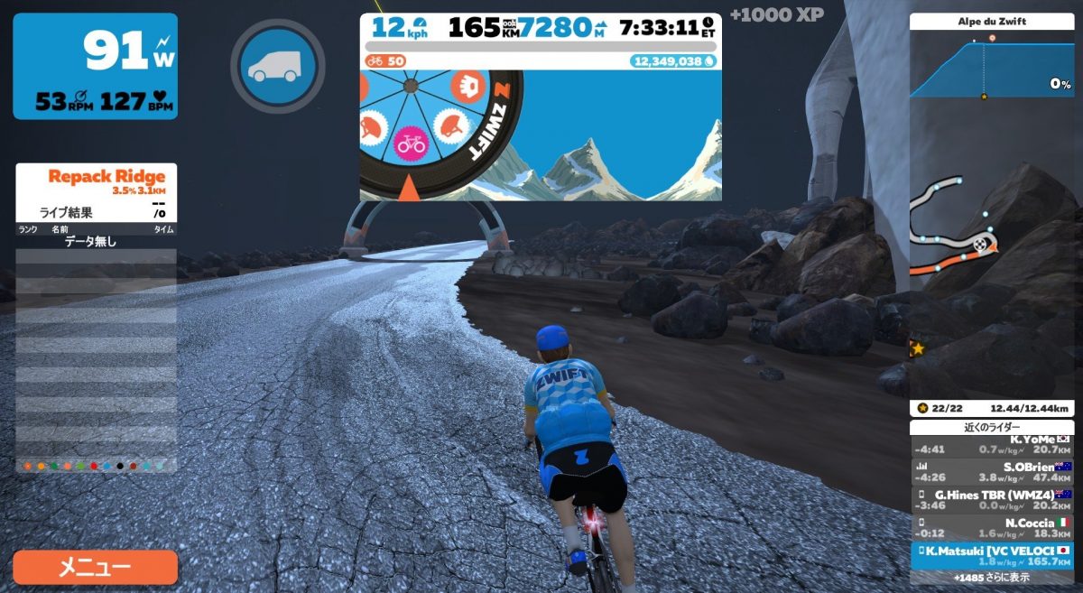 「ズイフトでのエベレスティングは、下りを完全に休憩に充てられるのが実走と違うところ。12分ほどあるので、しっかり補給できた」