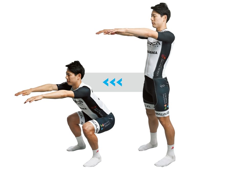 下半身の筋力と股関節、足首の柔軟性レベルをチェックする。まず、両手を前方へまっすぐに伸ばして、基本の姿勢を作る。そこから、ヒザの軌道がつま先と重なるように沈み込んでいく。股関節から動かす意識で、おもに臀筋中心に動かすのがポイントになる。