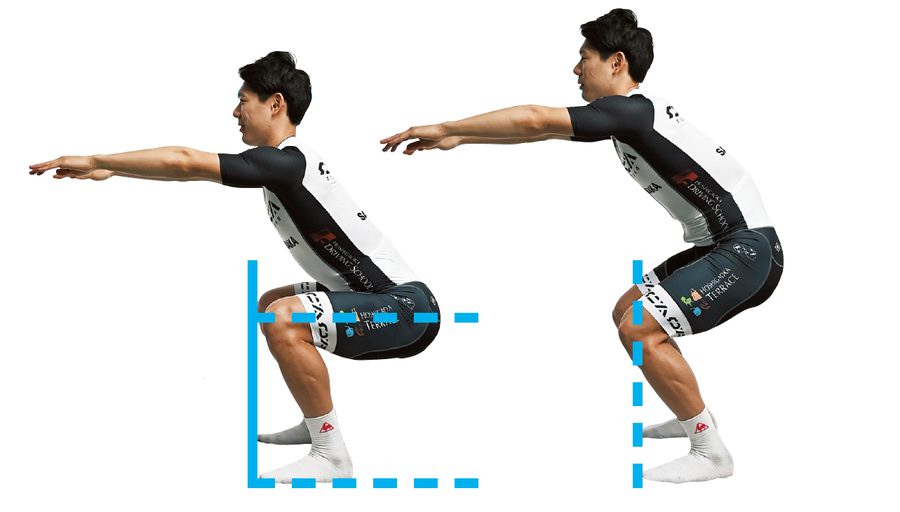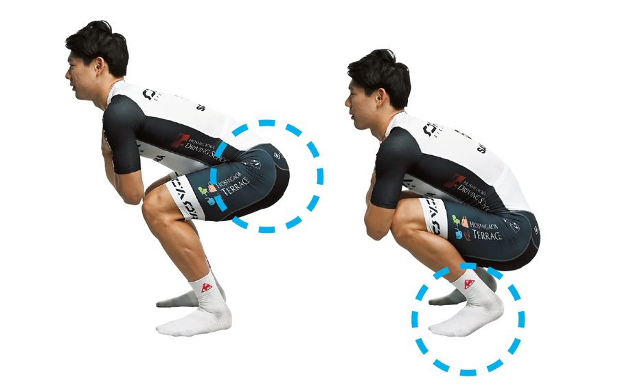 しゃがみ込みの途中で止まってしまうようなら柔軟性不足だ。またカカトが浮き出しても柔軟性が足りていないので筋トレによる足首の柔軟性向上が必須になる。