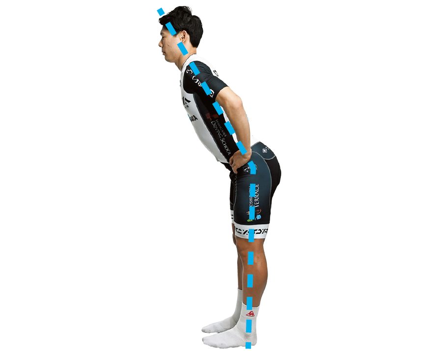 上体が60度ほど傾けることができれば一定の柔軟性がある証拠。45度くらい(写真)の人が多い。深くお辞儀できていても脊柱が丸まっている場合はエラー動作になる。