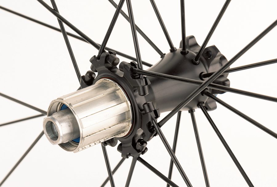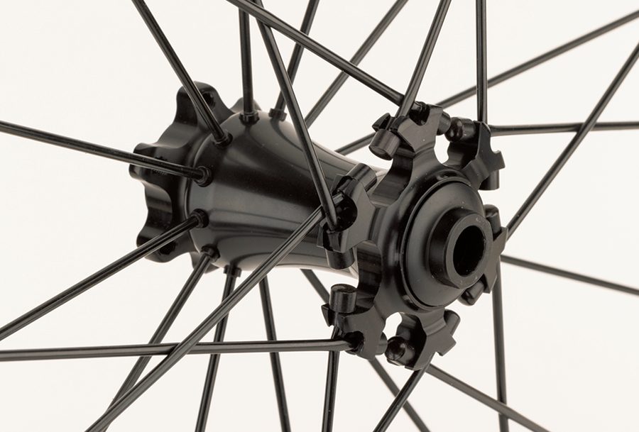 フロントはディスク側をラジアル組み、反対側をクロス組みとしたスポークパターンを採用。販売される商品はセンターロックとなる。