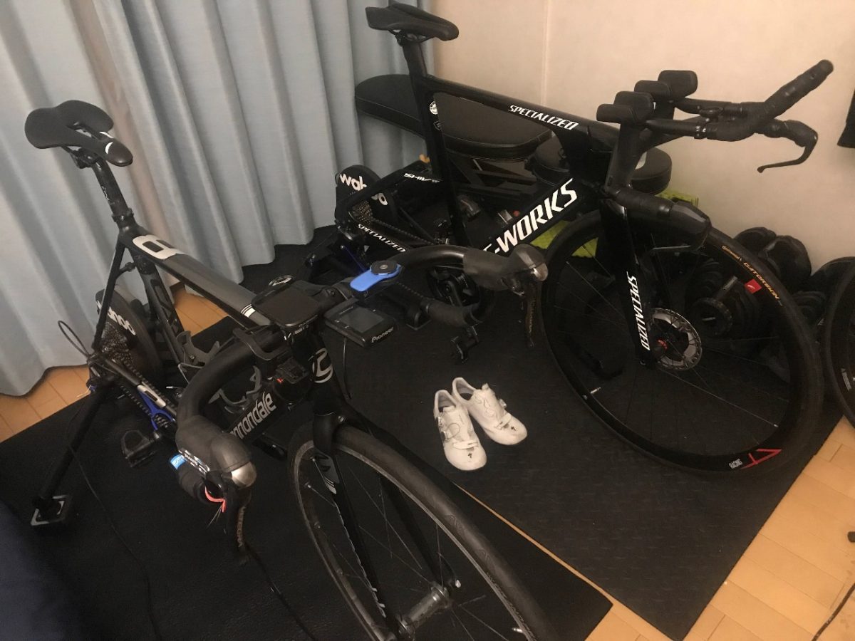 「3時間目安で小休憩することになっていたので、休憩ごとにロードバイクとTTバイクに交互に乗り替えて疲労の分散とポジション練習としました。最近、2台めのキッカースマートを購入したのが役に立ちました」