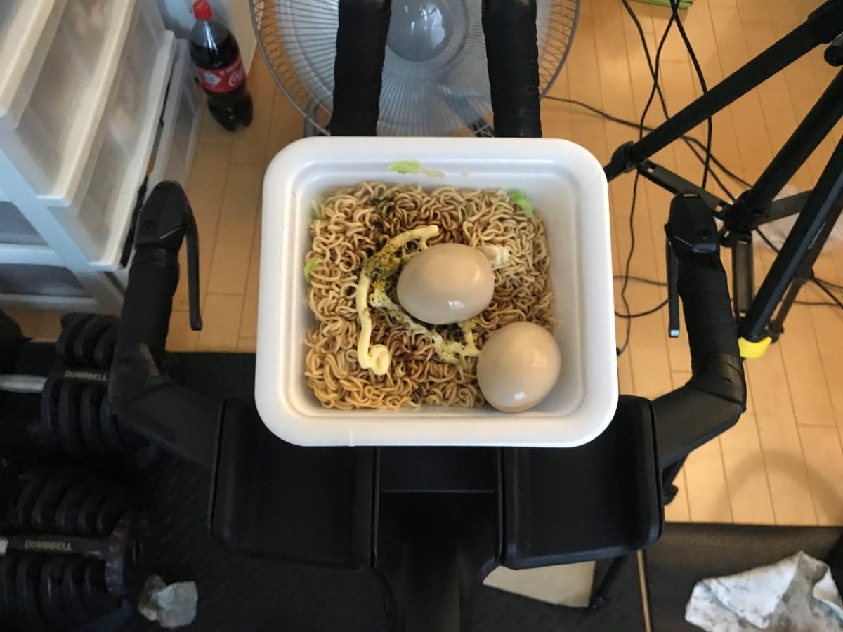前日にカップ焼きそば自体は買い込んでいたのですが、チャットで応援のなかに「ちゃんと煮卵をトッピングしないと」と指摘があり、休憩時間にコンビニに走って煮卵を調達することになりました。煮卵トッピングの焼きそばを何とか完成させたのですが、食べ始める前に休憩時間が終わってしまい、ローラーを回しながら食べることになりました。9時間の折り返しを過ぎたあたりでしたが、焼きそばを食べると元気が回復し、絶対に完走しようという気持ちがわいてきました(笑)。