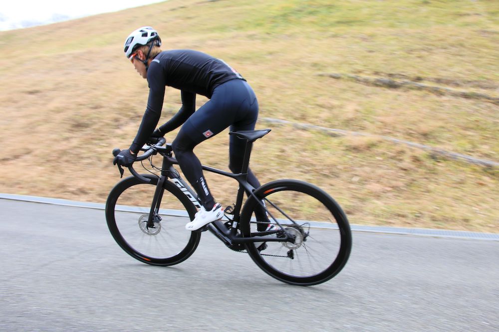 このバイクに乗った人の多くは反応の良さ、加速性能の高さを評価すると思う。それくらい中低速からの加速、踏み込んだ時の反応の良さが光っている。SLR1 42 ホイールのカーボンリムの軽さとGAVIA COURSE 1チューブレスレディタイヤの影響もあってか、気持ちよく加速していく。ダンシング時のバイクの振りも非常に軽くて、スプリントのようにもがいても、ねじれ方向への剛性が高くてもたつくこともない。レースでアタックが続くような展開やストップ&ゴーの多いコースでは武器になりそうだ。