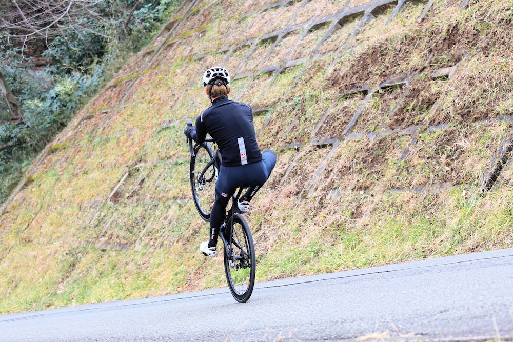 TCRは軽いとはいえ、以前乗っていたSRAM RED eTap + 各所にチタンボルトを換装したバイクに比べれば当然重い。踏んだ力を推進力に変える性能は高いので、スペックからしたら登るバイクだけど、軽いパーツで組んでみたいという思考が頭をよぎったのがシッティング時の最初の感想。しかし、腰を上げてビックリしたのが登坂力で、前記の通りダンシングの振りが軽いことが登りでより顕著に表れた。もともと登りではギアを掛けてダンシングを多用するタイプなので、よりその違いを感じたのだと思う。ディスクブレーキ化したものの、スルーアクスルの採用とリアのエンド幅を142mmに広げただけのポン付けモデルに多いダンシング時のリアの重さ、後ろに引っ張られるような感覚もなかった。
