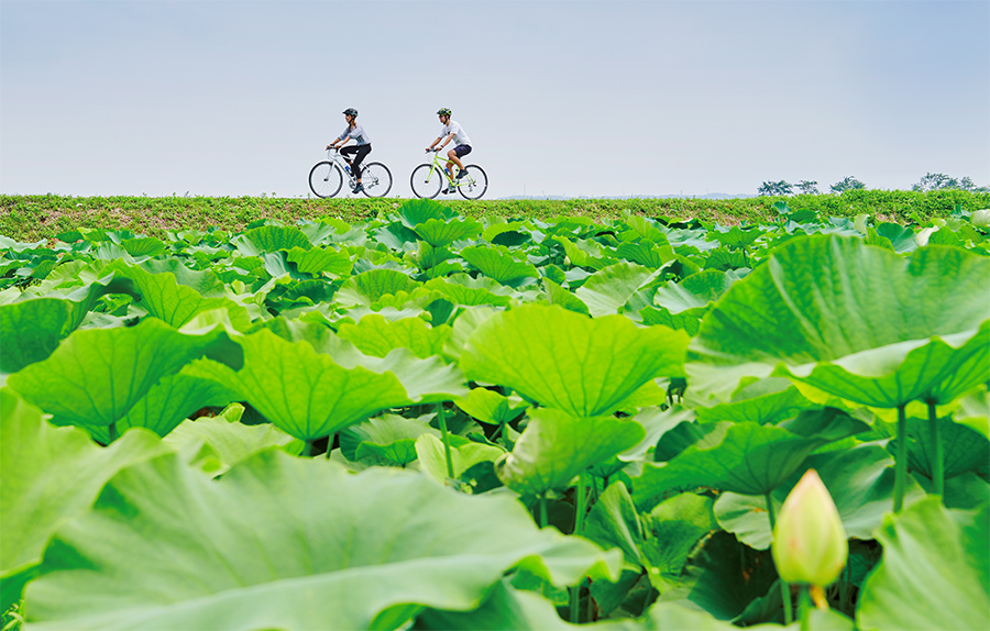 霞ヶ浦に広がる蓮畑には、夏のあいだ美しい蓮の花が咲く。とくに早朝の花が美しく、モーニングライドで神々しい美景を楽しむサイクリストも多い