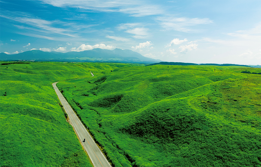 緑の絨毯と呼ぶにふさわしい広大な草原はもちろん、四季折々の表情を見せる火山群、くじゅう連山など絶景ポイントも豊富