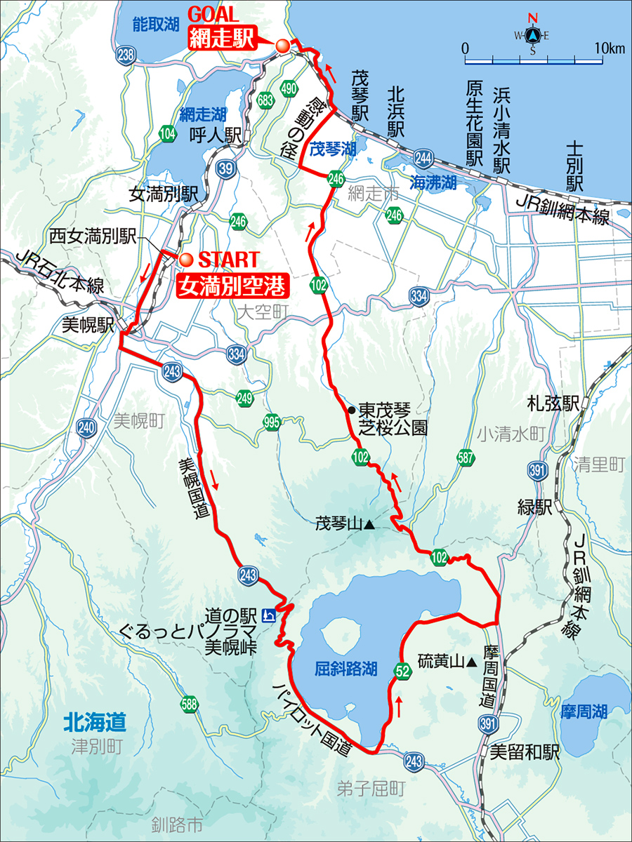 中・上級者にちょうどいいルート。初級者は女満別空港から屈斜路湖を見て、川湯温泉で電車に乗り、網走まで向かうといい。