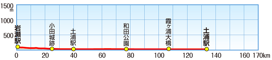 水戸線岩瀬駅を起点に伸びる「つくばりんりんロード」の愛称で親しまれた旧筑波鉄道跡の自転車歩行者専用道と、霞ヶ浦の湖岸道路とを組み合わせた平坦コース。霞ヶ浦大橋以北と、潮来までを含め、フルに走るとルートの総長は180km。