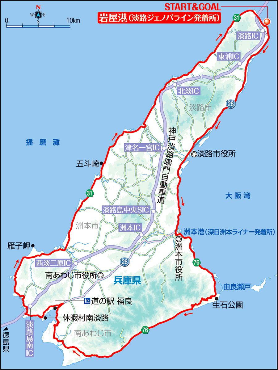 旅客船の便数が多いので、ゴール時間が読めないサイクリング旅にはありがたい。島南部の激坂に自信のない人は一周にこだわらず、洲本から国道28号で福良まで、さらに県道31号で湊までショートカットするのもオススメ。兵庫県がウエブサイトで公開しているコースマップは、激坂や狭路がどこにあるか一目瞭然だ