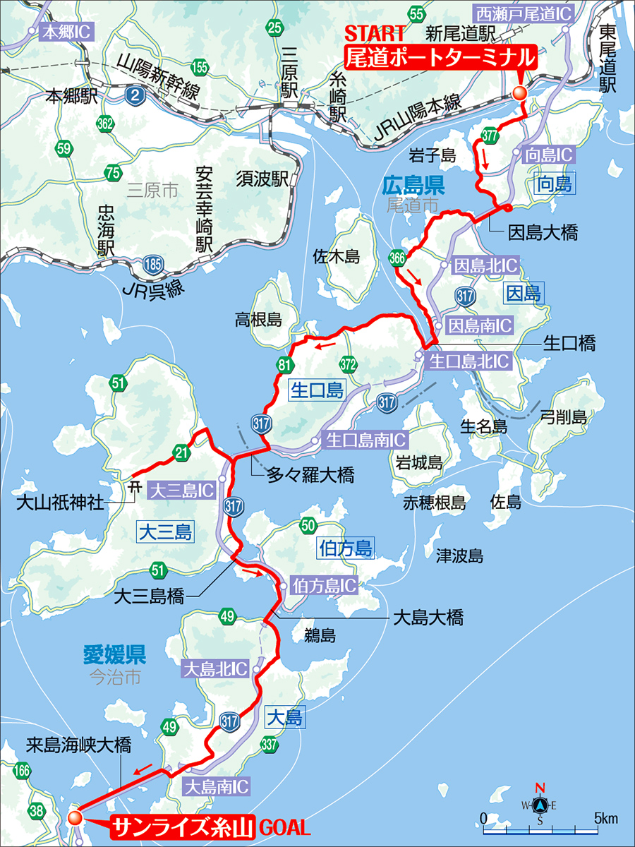 新幹線は新尾道駅から尾道まで自走(4km)。新大阪から新尾道駅は早朝7時30分に、東京駅からは10時くらいには到着する。航路は広島空港から尾道まで下り基調の約35kmを自走。羽田空港からなら早朝8時30分くらいに到着。