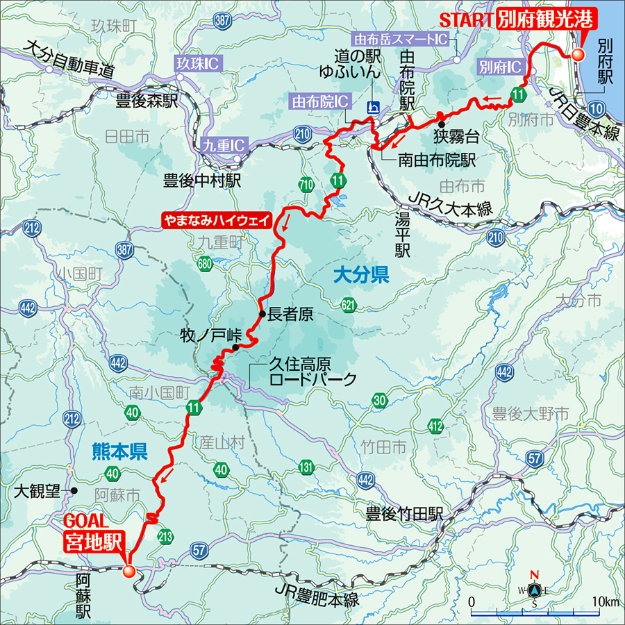 大分県の別府から、「九州の屋根」と呼ばれるくじゅう連山の中央を貫き、熊本県の阿蘇へ向かう美しいパノラマの中を駆け抜ける絶景ルート。