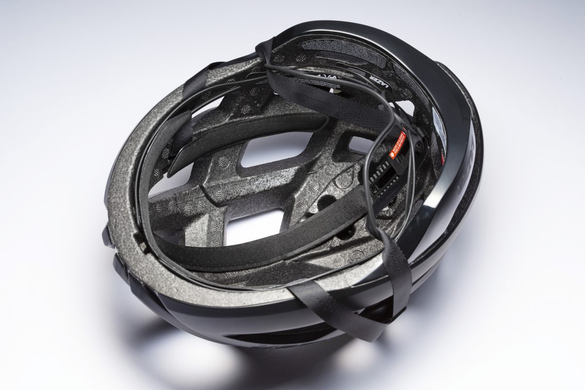 ヘルメット内部のポリカーボネートロールケージ構造が、頭部全体のフィット感のコントロールを適切に保つ。