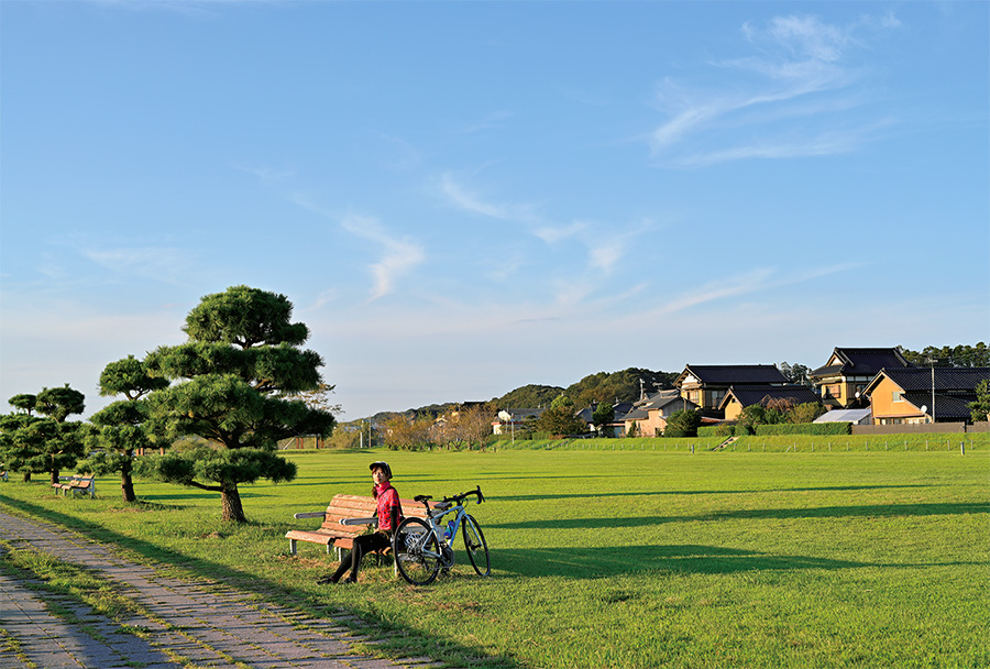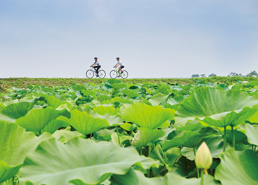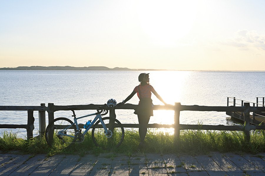 クルマとの分離が進み、平坦で日の光に輝く穏やかな霞ヶ浦の湖面を眺めながら、ゆったりと走れる湖畔道路。経験や年齢を問わず、多くの客が訪れる人気のサイクリングコースだ。とくに北部には関連施設が集中し、土浦駅から短距離の周遊を楽しむケースを含め、霞が浦のマストゾーン。複数のレンタサイクルポートが設置され、鉄道や茨城空港にもアクセス可能。土浦〜玉造〜潮来を結ぶ水上交通「霞ヶ浦広域サイクルーズ」も利用可能(詳細はP31)と、多様な遊び方ができる。高浜や天王崎公園など、筑波山と霞ヶ浦を望む美しい夕景スポットも押さえておきたい。湖面の眺めを楽しむなら、潮来をスタートする反時計回りがいいだろう。