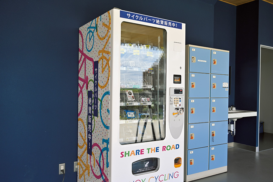 ひととおりの自転車用品が並ぶ自動販売機もあり