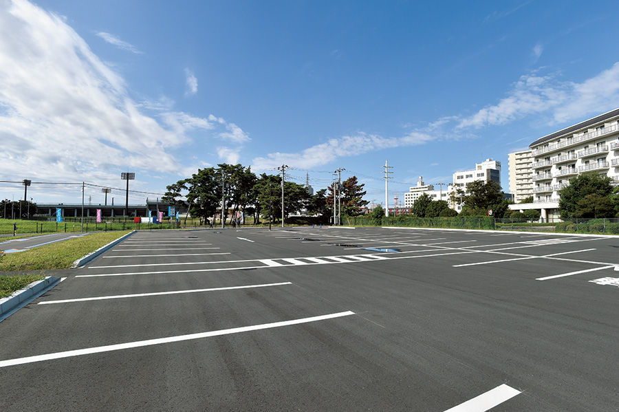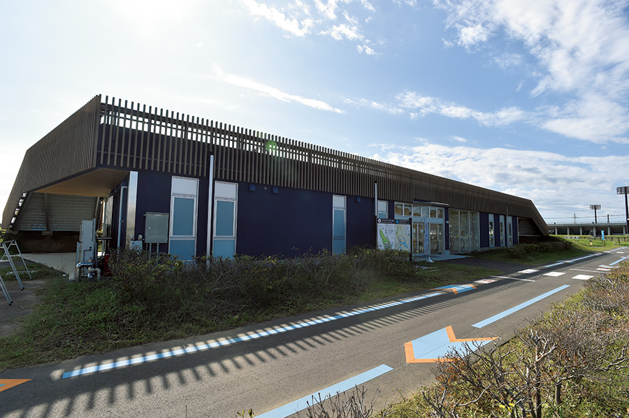 ルート沿いに立つりんりんポート土浦には、みんなが集える休憩所、メンテナンススペース、トイレ、シャワー室が設置