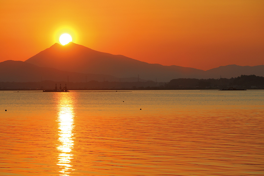 筑波山の二つの峰の間に夕日が沈む「ダイヤモンド筑波」は、小美玉市内から狙える