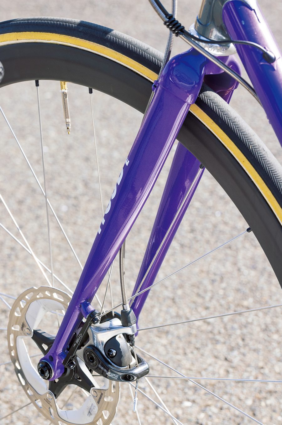 リアのキャリパーマウントはチェーンステーの設計に自由度を持たせるためフロント用のフラットマウントをあえて採用。エンド部の剛性向上とホイールのスムーズな回転のためスルーアクスルを用いる。