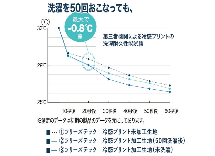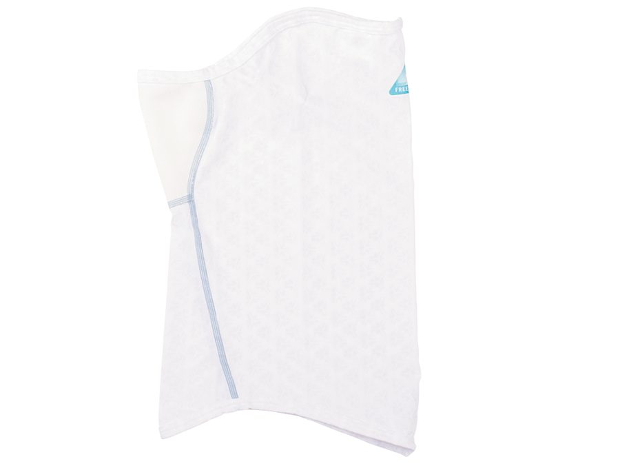 生地の接触冷感機能のほか、プリントによる冷感機能も発揮されているため、その持続力も強い。洗濯を繰り返してもフリーズテック未加工品に比べて高い冷感機能を保つ。春から夏、秋という長い間使えるギアとして重宝できる。