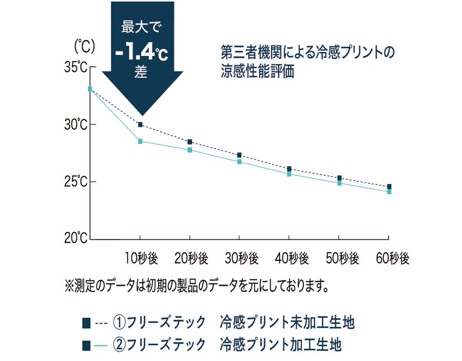 フリーズテックのプリントによる吸湿吸熱効果機能付加の評価試験結果では、一般的な接触冷感機能のみの生地に比べて、プリント加工をした生地のほうがさらに-1.4℃の冷感を実現することがわかった。風を受けるとさらに体感温度が下がる。