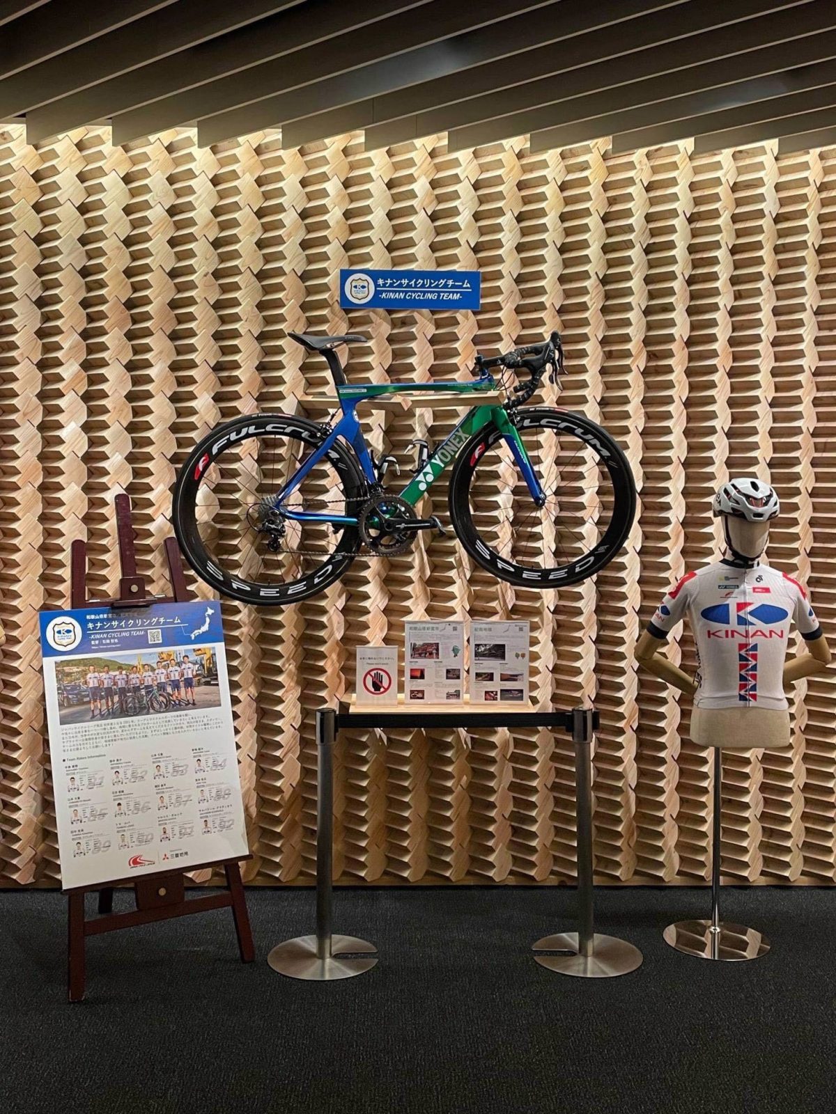 キナンサイクリングチームが使うチームキット、ヨネックスのバイクが展示されている