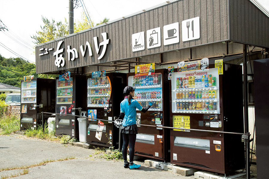 精進湖のほとり。自動販売機が充実していて、ベンチで食べられる軽食もあり、サイクリストに愛される休憩スポット。レストランもある