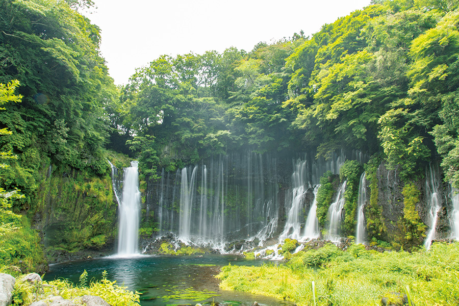 高さ20m幅150mの湾曲した絶壁から湧く富士山の雪解け水が織りなす大小数百の滝が連なる「白糸の滝」。眺めるには階段の行き来が必要だが、清涼で気持ちいい空間だ