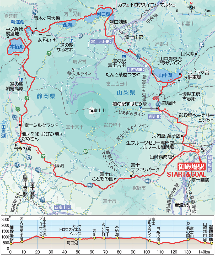 御殿場をスタートし、森や富士山との調和も美しく澄んだ富士五湖を巡りながら西に向かい、黄緑の牧草に覆われた平原が広がる朝霧高原を南下した後、富士南嶺道路を東進、ゴールへ向かう。観光地が多く、立ち寄りやお手洗いには困らないが、距離も長く、アップダウンも多いため、各スポットでの楽しみすぎに注意。テンポよく走りたい。