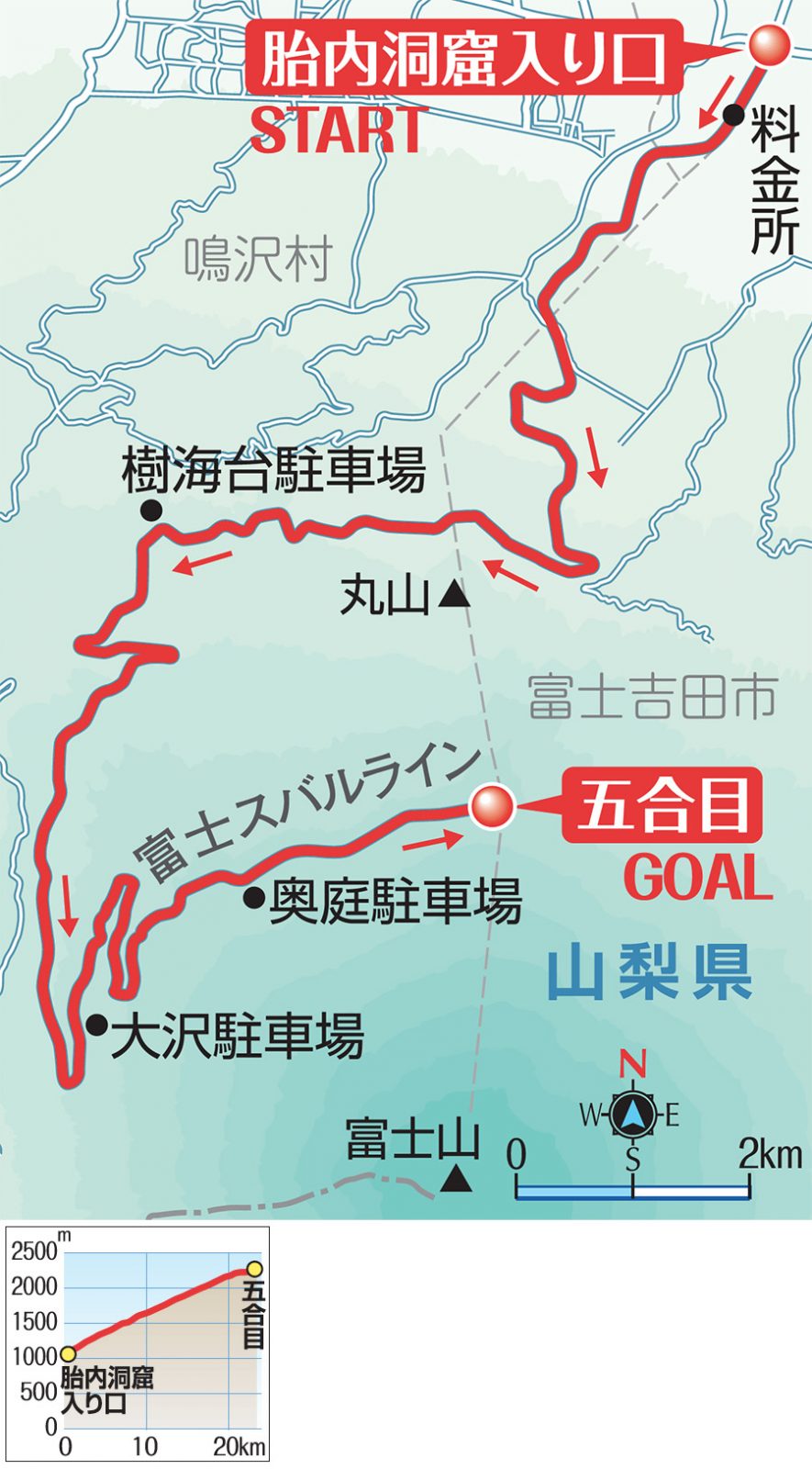 富士北麓から五合目を目指し、24kmで1255mを上るルート。平均勾配は5.2%と緩く、最大勾配も8%程度。勾配の緩急が少ないためビギナーでも走りやすい。平坦に近い区間も含まれ、作戦の練りがいもあり、タイムに挑むおもしろさも大きく、多くの挑戦者を魅了するコース。五合目にも店舗が多く楽しめる。通行料200円。