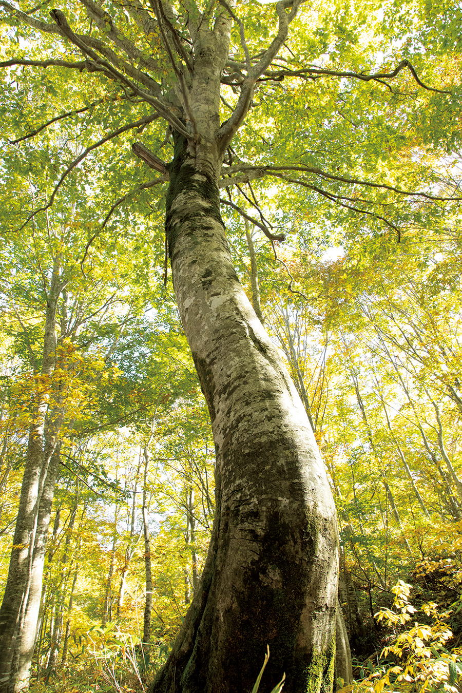 降り積もる雪にあらがい、根本が曲がった木々が自然の厳しさを語る。立ち姿は力強く、美しい