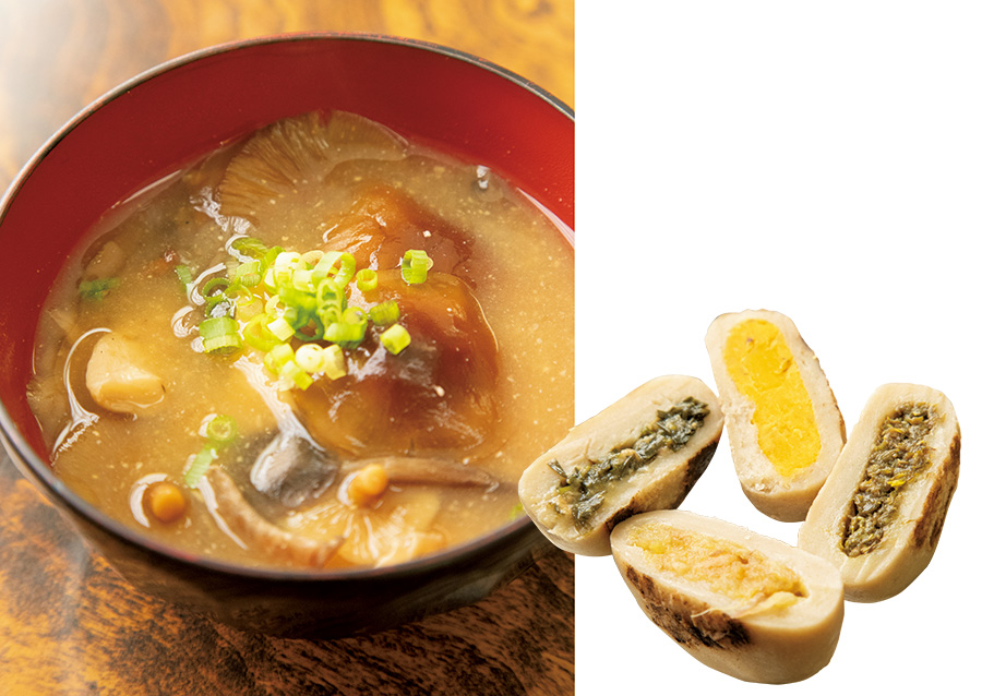 鎌池のほとりに立つ。左/味わい深いきのこたっぷりのきのこ汁 右/そば粉とジャガイモで作る小谷名物「ちゃのこ」。ニョッキのようなもちもち生地に手作りの具が包まれる。ちゃのこは「おたり名産館」でも購入可能
