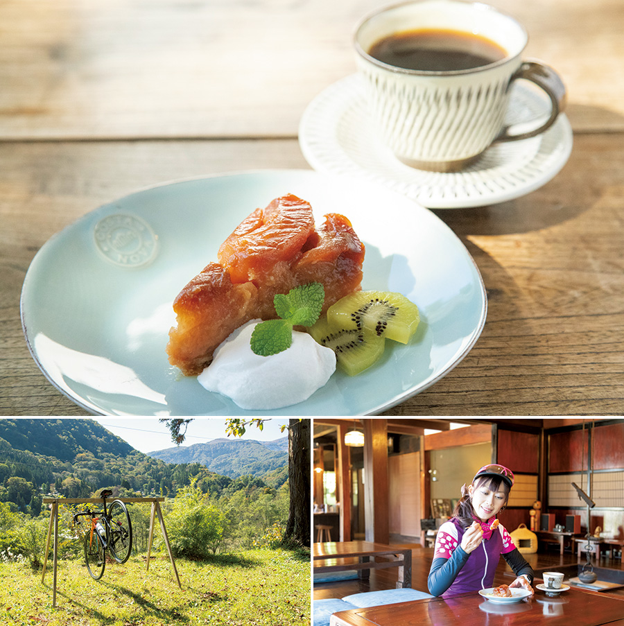 里山の中におだやかにたたずむ。上/こだわりのコーヒーを旬の素材を使った手作りケーキとともに 下左/サイクルラックも美しい景観の一部になる 下右/古民家を改装した店内には自然光が差し込み、居心地のよい空間が広がる ※冬期休業あり